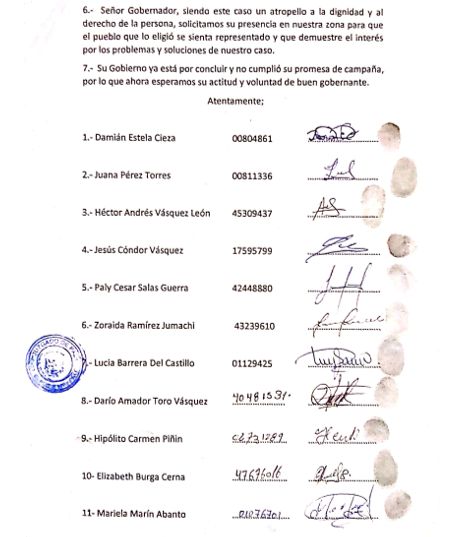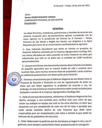 Solicitan presencia del gobernador regional Pedro Bogarín en el lugar, e invocan no otorgar título a nombre de empresa agro ganadera a quien acusan de deforestar las cabeceras de tres quebradas.