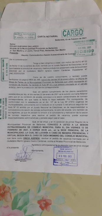Primer Regidor de Bellavista cita a sesión extraordinaria para el viernes 12 de febrero para tratar pedido de vacancia del alcalde Eduar Guevara Gallardo