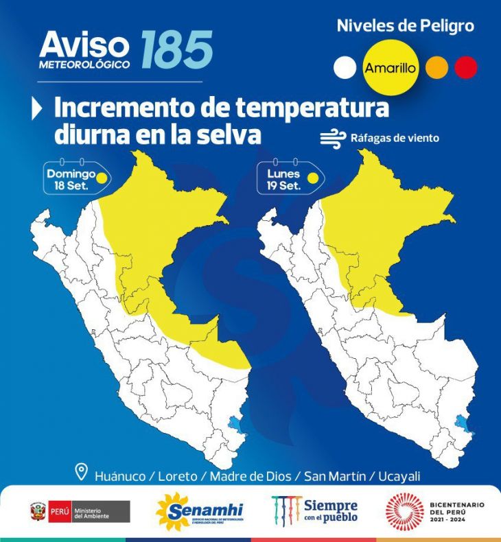 La temperatura diurna en la selva de los departamentos Huánuco, Loreto, Madre de Dios, San Martín y Ucayali aumentará este domingo 18 y mañana lunes 19 de setiembre, estimándose valores superiores a los 36 grados Celsius, informó el Servicio Nacional de Meteorología e Hidrología (Senamhi).